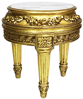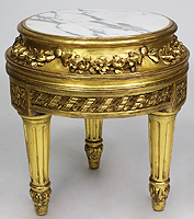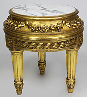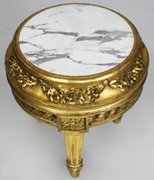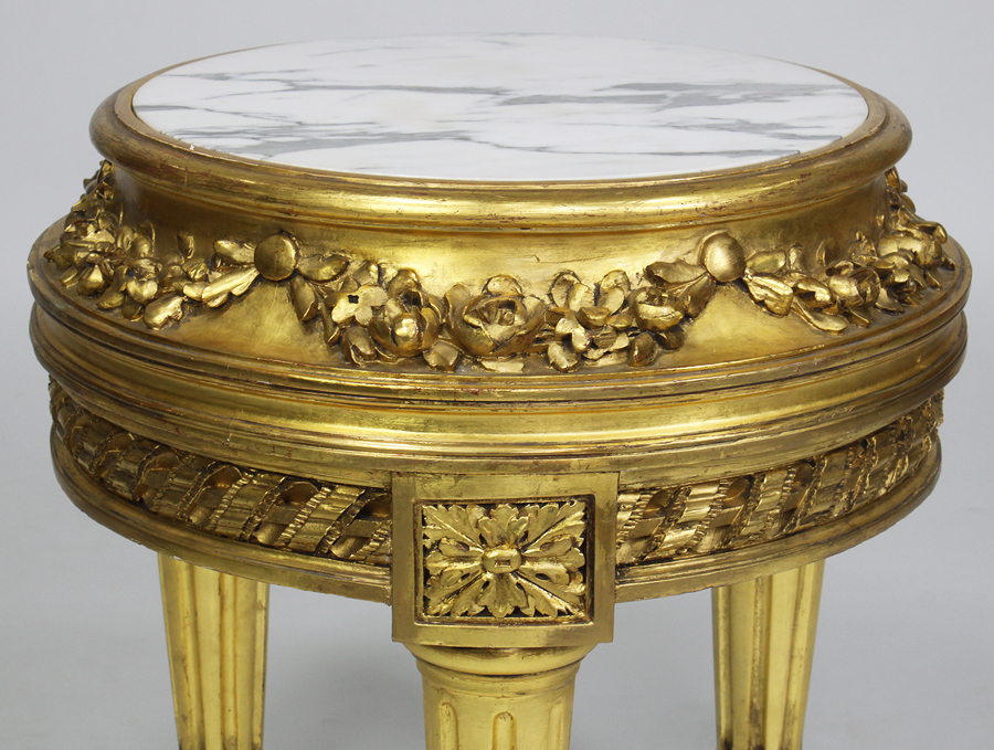 A French Belle Époque Louis XVI Style Giltwood Carved Pedestal Stand with Marble Top. The circular pedestal with carvings of flowers and fitted with a veined white marble top, raised on three fluted legs. Circa: Paris 1920.