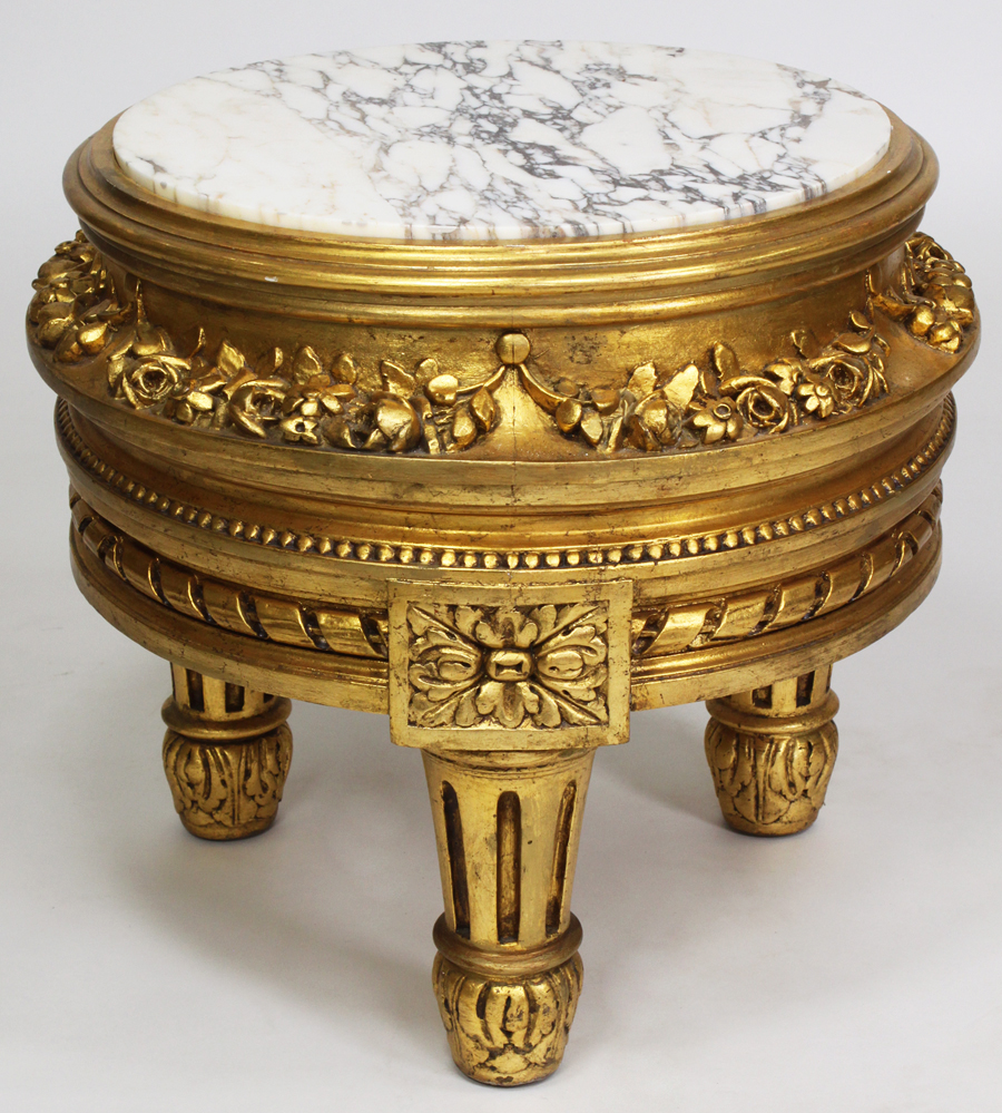 A French Belle Époque Louis XVI Style Giltwood Carved Pedestal Stand with Marble Top. The circular pedestal with carvings of flowers and fitted with a veined white marble top, raised on three low fluted legs. Circal Paris, 1920.