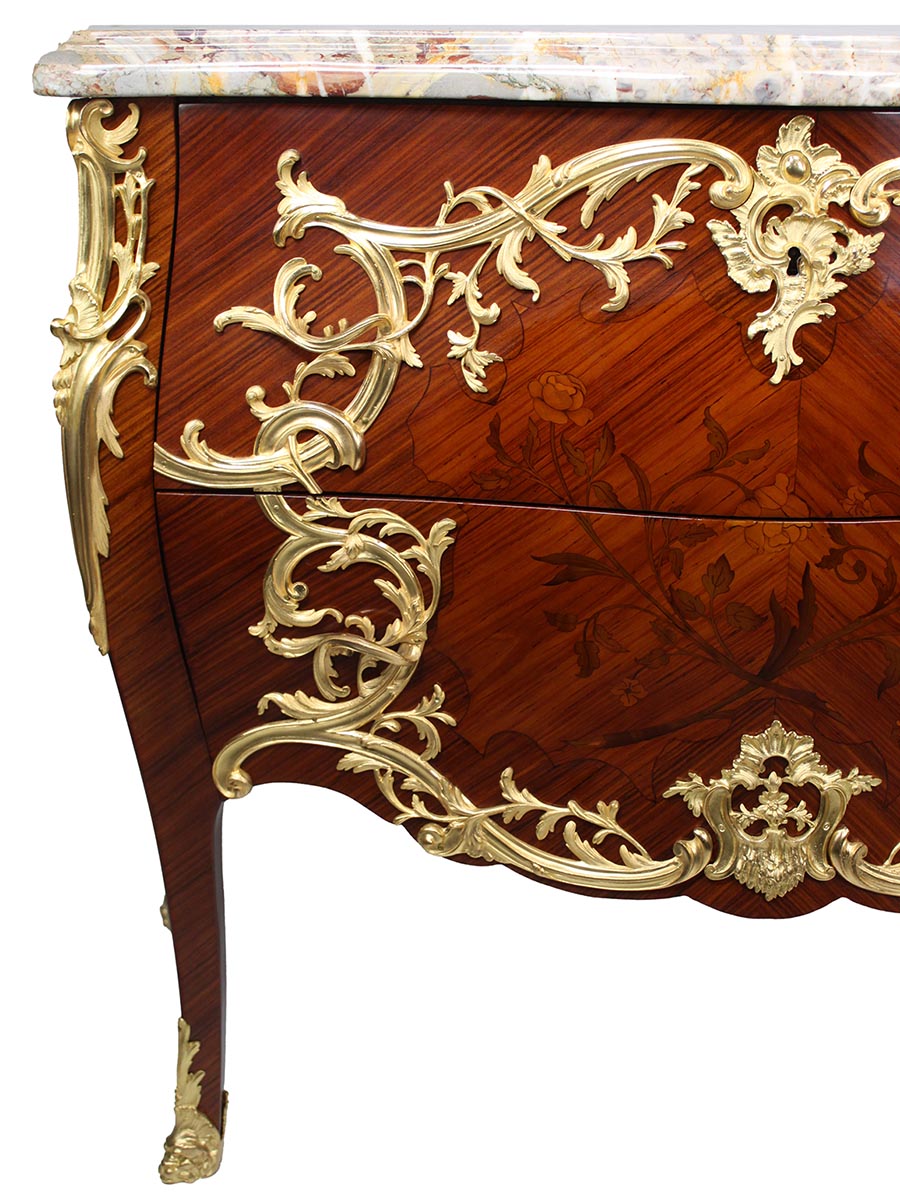 Note: These beautiful commodes have a slight different floral marquetry, the upper drawer of one of them has a curled gilt-bronze mount at each end, the other does not. One commode has floral marquetry on the sides, the other one has no marquetry on the sides. The marble tops are not original to the commodes and are recent.