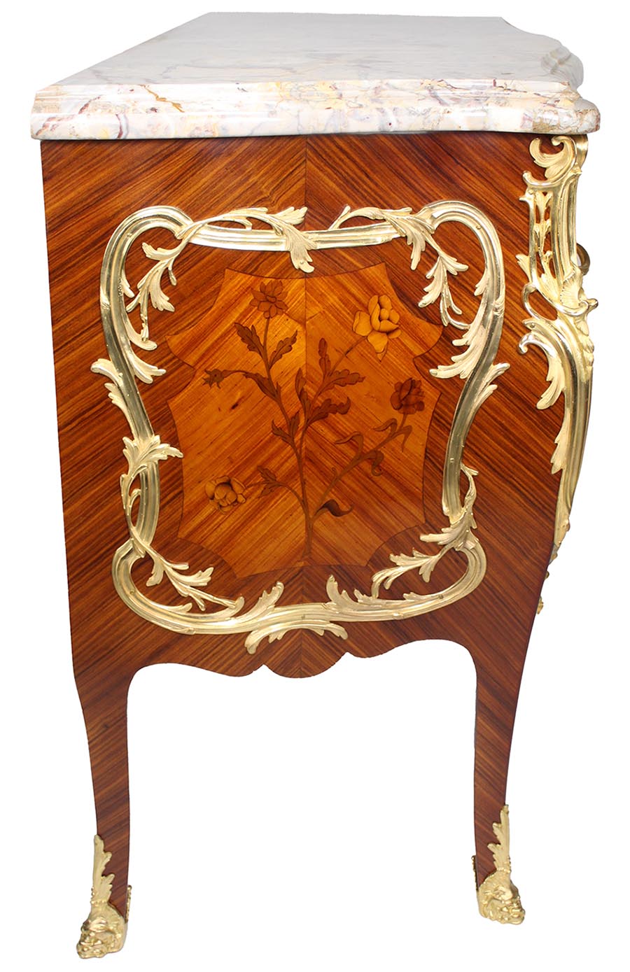 Note: These beautiful commodes have a slight different floral marquetry, the upper drawer of one of them has a curled gilt-bronze mount at each end, the other does not. One commode has floral marquetry on the sides, the other one has no marquetry on the sides. The marble tops are not original to the commodes and are recent.