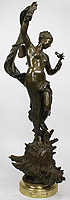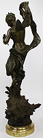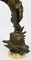 A Fine Italian 19th/20th Century Patinated Bronze Figure of "La Fée des Mers" (The Spirit of the Seas) after Luca Madrassi (Italian, 1869-1914). The beautifully executed slender figure of a nude nymph or maiden, in a brown-green patina, wrapped with a loose scarf, standing atop of a conch seashell and holding a flower bouquet. Signed 'Madrassi' to front of the seashell, raised on a rotating gilt-bronze circular plinth. A bronze plaque reads "La Fée des Mers par Madrassi Scul ur". Circa: 1900.