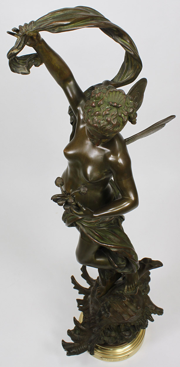 A Fine Italian 19th/20th Century Patinated Bronze Figure of "La Fée des Mers" (The Spirit of the Seas) after Luca Madrassi (Italian, 1869-1914). The beautifully executed slender figure of a nude nymph or maiden, in a brown-green patina, wrapped with a loose scarf, standing atop of a conch seashell and holding a flower bouquet. Signed 'Madrassi' to front of the seashell, raised on a rotating gilt-bronze circular plinth. A bronze plaque reads "La Fée des Mers par Madrassi Scul ur". Circa: 1900.