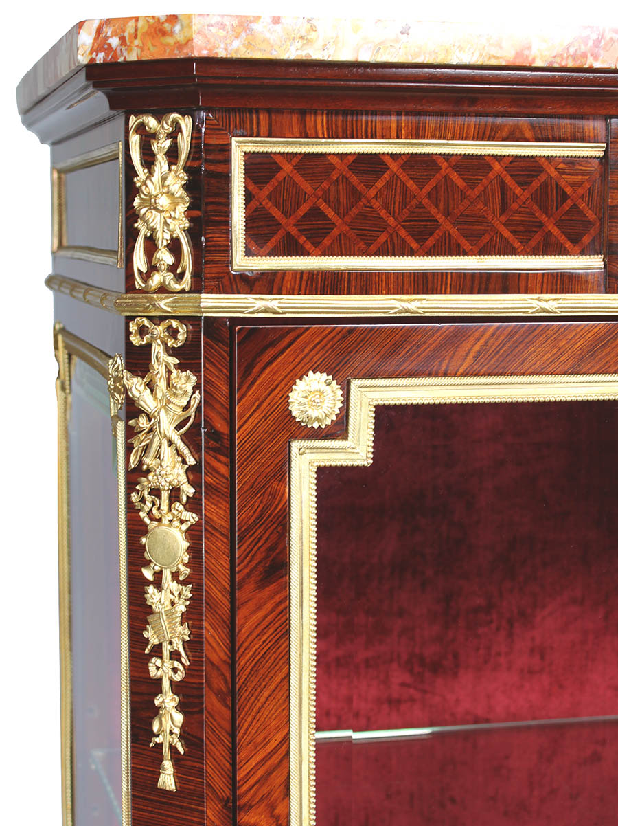 A Very Fine French 19th-20th Century Louis XV Style Ormolu and Jasperware-Mounted Rosewood, Mahogany and Kingwood Parquetry Single Door Vitrine, possibly by François Linke (1855-1946). The upper front apron centered with an allegorical Jasperware plaque depicting playful Putti with a goat, flanked on the corners by ormolu mounts of crossed torches and flames, cross flutes, a tambourine, a pan flute, ribbons and a tassel. The door surmounted with an oval Neoclassical Jasperware plaque, probably Wedgwood, of a maiden with a cherub symbolic to Love, within a ribbon tied ormolu frame. Fitted with a variegated marble top and raised on four cabriolet legs ending on hooved-feet; with two interior lined with a burgundy color velvet and fitted with two glass shelves. (Unsigned). Circa: Paris, 1900.