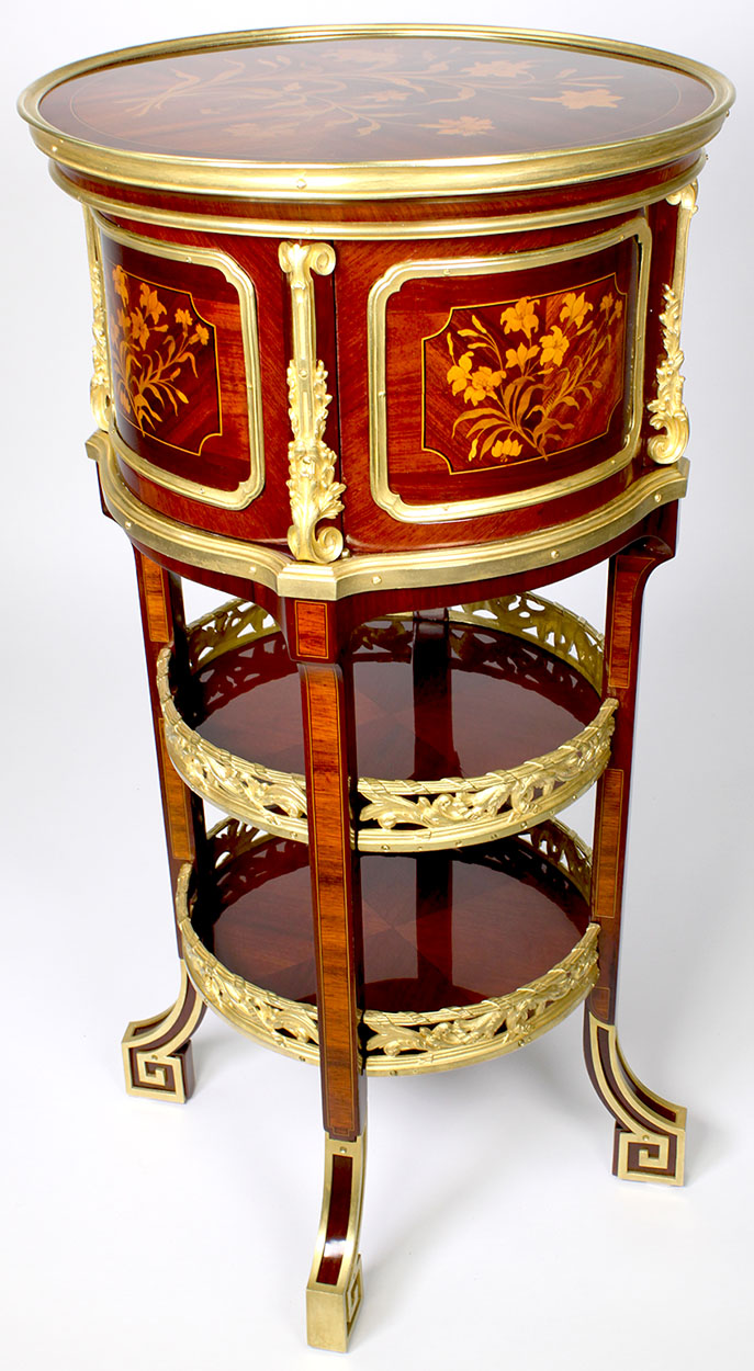 These beautiful tables are after the Work table model, cabinetwork attributed to Jean-Henri Riesener; model designed by Jean-François Oeben, c. 1765 (F313) currently at The Wallace Collection in London, UK. The Wallace describes it with its integrated candle branches and silk-covered shelves for needlework, this little table was the perfect accessory for a wealthy lady’s sitting room in the 18th century. It was made in the workshop of Jean-François Oeben, probably by Riesener when he was a young man.