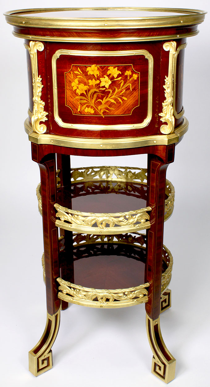 These beautiful tables are after the Work table model, cabinetwork attributed to Jean-Henri Riesener; model designed by Jean-François Oeben, c. 1765 (F313) currently at The Wallace Collection in London, UK. The Wallace describes it with its integrated candle branches and silk-covered shelves for needlework, this little table was the perfect accessory for a wealthy lady’s sitting room in the 18th century. It was made in the workshop of Jean-François Oeben, probably by Riesener when he was a young man.