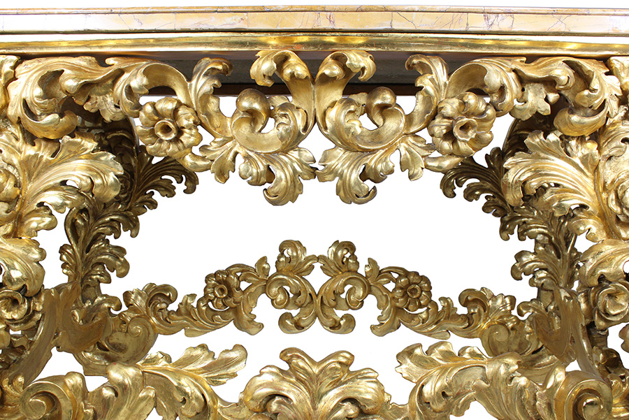 A Large and Very Fine Italian 19th Century Florentine Baroque Style Giltwood Carved Wall Console Table with Marble Top. The ornately carved rectangular shaped scrolled body frame in a leaf and floral design with scrolling foliate and acanthus, fitted with a rectangular moulded Siena marble veneer top. Circa: Florence, 1850.