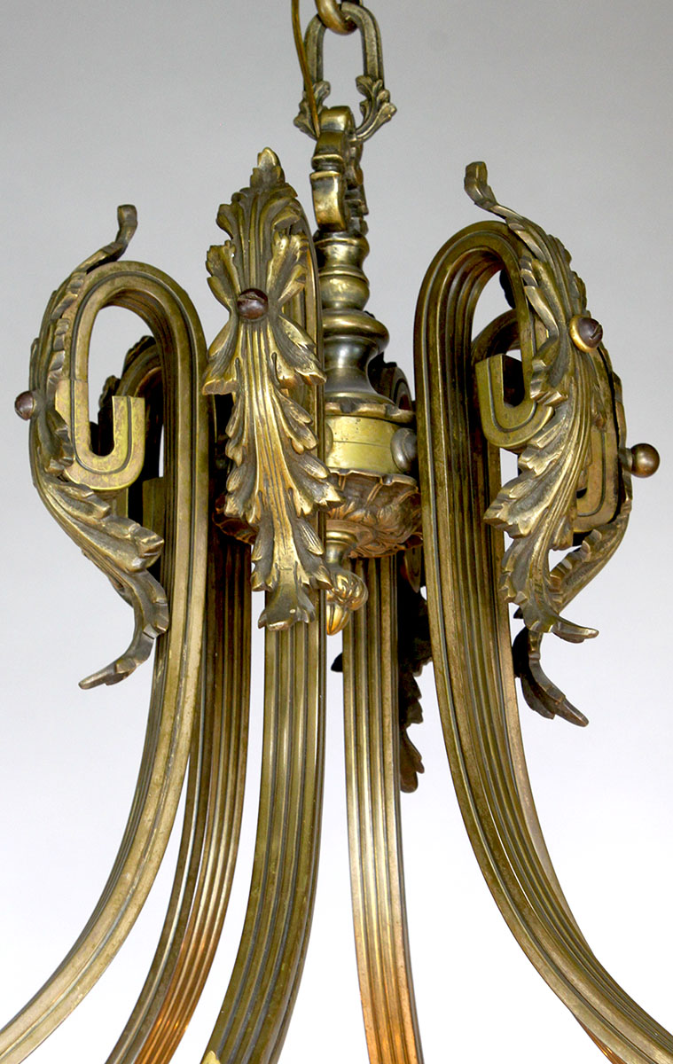 A Large French Early 20th Century Art-Deco Bronze and Carved Veined Ivory-Colored Alabaster Six-Light Chandelier. The carved circular alabaster plafonnier with a floral bronze apron and four interior lights, surmounted with six alabaster cone-shaped candle-arms, each supporting a single-light alabaster shade. The body suspended with scrolled brass supports mounted with bronze acanthus leaves and topped with a scrolled crown. Circa: Paris, 1920's.