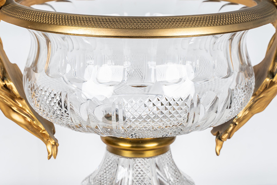 A Large and Impressive French Empire Revival Style Gilt-Bronze and Cut-Glass 'Grande Coupe ' Figural Urn Centerpiece, in the manner of Baccarat; The mounts in the manner of Pierre-Philippe Thomire (French, 1751-1843). . The two-part ovoid finely cut-glass bowl surmounted with twin figures of Napoleonic style winged maidens, with a chased gilt-bronze ornamental trim, all above a square chased gilt-bronze plinth chased with acanthus leaves. Circa: Mid to late 20th Century.