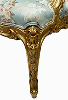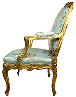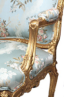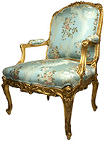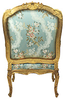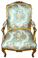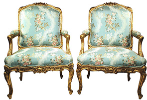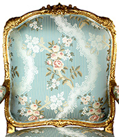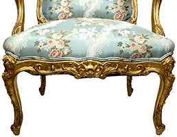 A Very Fine Pair of French 19th Century Louis XV Style Giltwood Carved 'Fauteuils a la Reine' Armchairs. The superbly carved frames, with padded backs, armrests and seats, all upholstered in a recent silk and cotton fabric, topped with floral carvings, with open scrolled armrests carved with an acanthus design and raised on cabriolet legs with an acanthus and seashell designed apron. The backs with an intricate chased/carved filigree design. Circa: Paris, 1880.