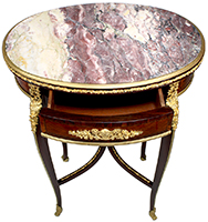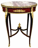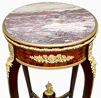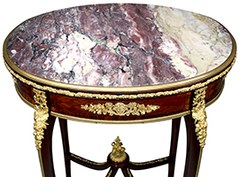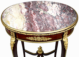 A Very Fine French 19th-Early 20th Century Louis XV Style Mahogany, Tulipwood, Parquetry and Ormolu Mounted Oval Gueridon Side Table with a Brêche Violette marble top, attributed to François Linke (1855-1946). The inset oval Brêche Violette marble top with a gilt-bronze surround, above a lozenge parquetry frieze with foliate ormolu mounts, with a drawer to one side, on cabriole legs headed by clasps and joined by an 'X'-shaped stretcher centered by a foliate finial, on scroll sabots. Unsigned. Circa: Paris, 1900.