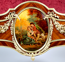 A Very Fine French 19th Century Louis XV Style Ormolu Mounted Kingwood, Satinwood and Vernis Martin Decorated Single-Door Vitrine, probably by François Linke (1855-1946). The white marble top structure centered with an allegorical gilt-bronze plaque depicting cherubs with playing musical instruments while hovering amongst the clouds, flanked by corner floral mounts and sunburst medallions, raised of four cabriolet legs with paw feet, the central door fitted with finely chased gilt-bronze mounts of floral wreaths, ribbons and finial, centered with an oval painting depicting a courting scene with a seated couple in the manner of François Boucher (French, 1703-1770), with two interior glass shelves. Unsigned and unmarked. Circa: Paris, 1890-1900.