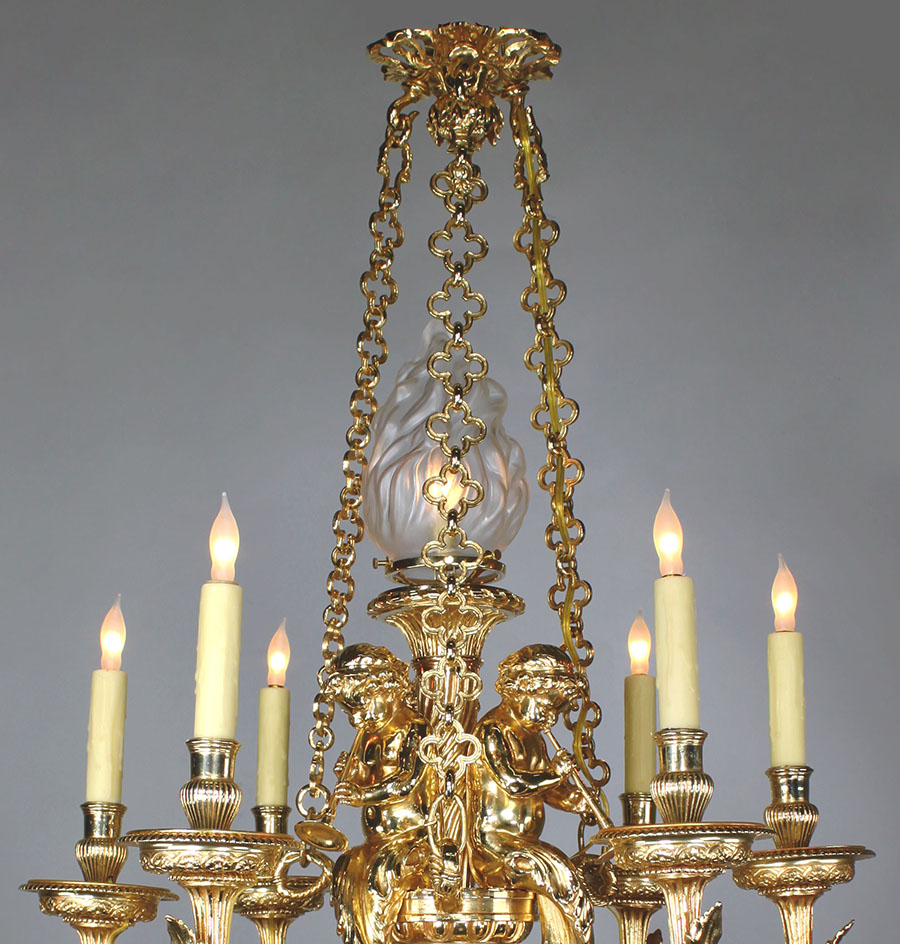 Note: The original model of this chandelier by Pierre Gouthière is illustrated by H. Ottomeyer et al., p. 238, fig. 4.4.1. The design for the chandelier is also illustrated in the aforementioned literature, p. 238, fig. 4.4.2., which is now in the Museé des Arts Décoratifs.