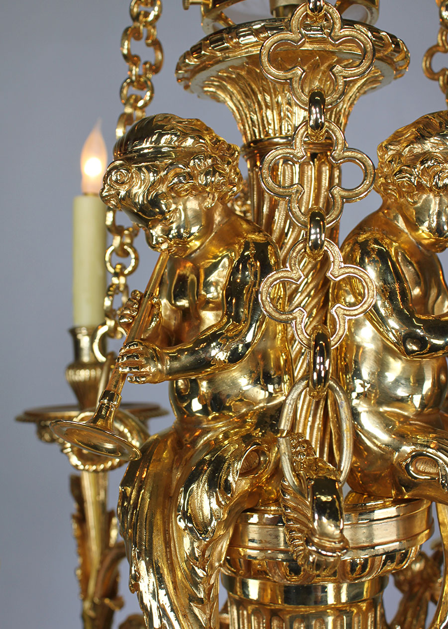 A French Louis XVI Style Gilt-Bronze Figural Seven-Light Chandelier with Figures of Putti (Children), after the model by Pierre Gouthière in the Cabinet doré for Marie-Antoinette at the Royal Palace of Versailles. The nicely cast bright gilt-bronze body with six-scrolling candle-arms surmounted with acanthus and rosettes issuing from the center fluted stem, decorated with three seated cherubs playing trumpets, below a classical burning frosted glass-shade torch, all suspended with by three gilt-bronze chains. Circa: Probably 20th Century.