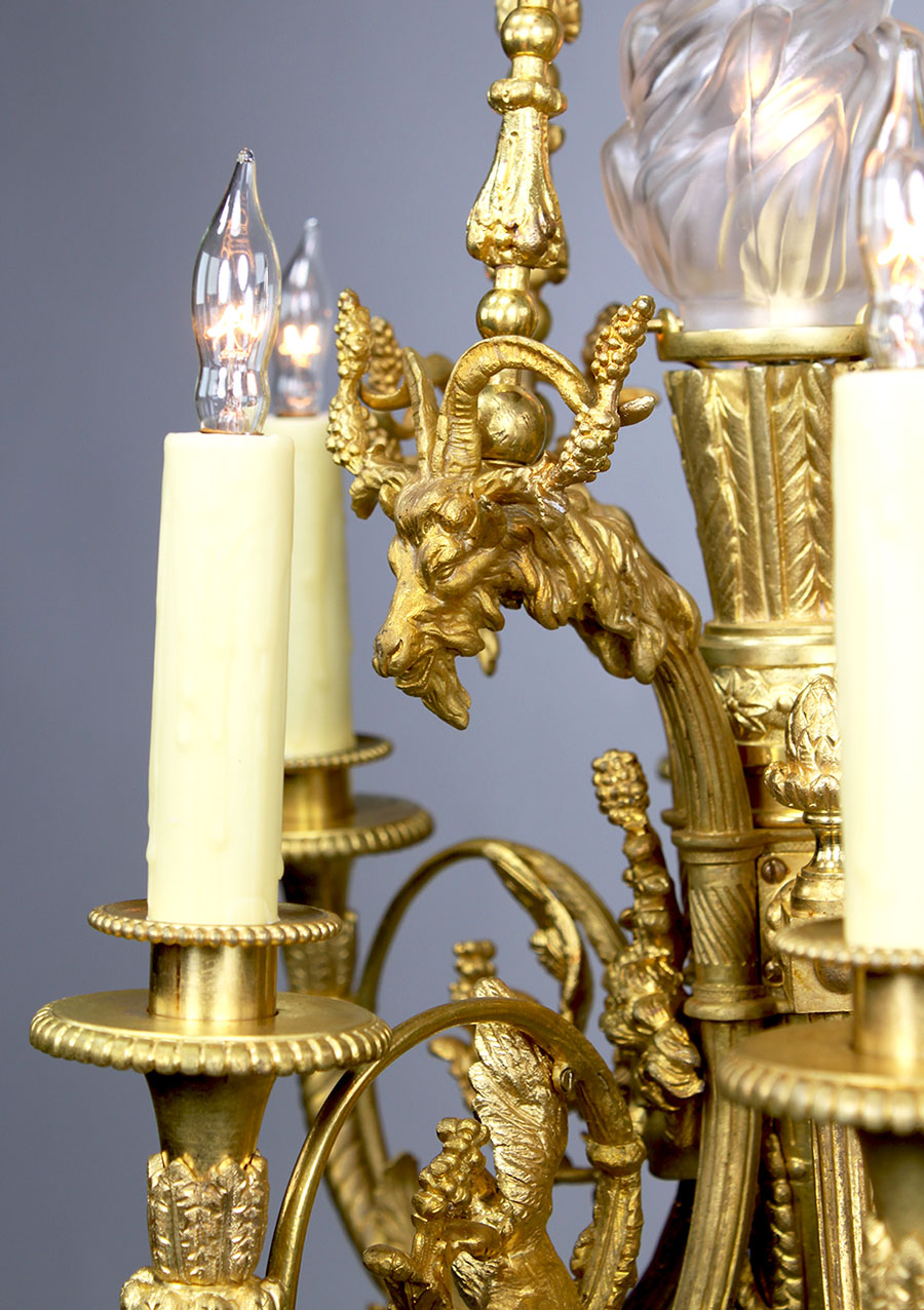 A Fine French 19th Century Louis XV Style Gilt Bronze Seven-Light Figural Chandelier. The elongated and ovoid gilt-bronze frame with six scrolled candle-arms (now electrified ) surmounted with doves, ram-heads, vines, rosettes, fruits and tassels, centered with flambeaux light fitted with a frosted glass flame shade, suspended on tri-tassel-decorated strands centered with an ormolu hovering cherub holding onto a circular floral ring, designed after a model by Pierre Gouthière (1732-1813) . Circa: Paris, 1890-1900.