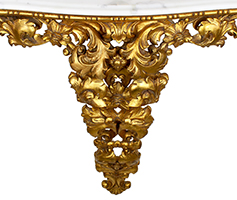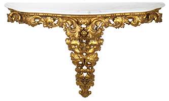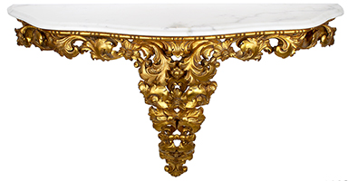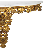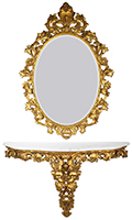 An Italian Florentine Gilt wood Carved Mirror and Console with Marble Top Set. The gilt-wood oval mirror frame with a floral and scrolled acanthus design, topped with an acorn shield and fitted with a beveled mirror plate. The wall mounted console with a matching gilt-wood carved design and topped with a veined white marble top. Circa: Florence, 1900-1920.