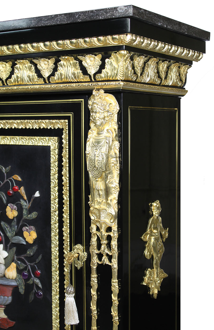A Very Fine French 19th Century Napoleon III Ormolu Mounted Ebonized Wood and Pietra Dura Meuble d'Appui à Hauteur with a grey marble top. The single front-door black-lacquered cabinet centered with a Pietra Dure (Semi precious hard stones) plaque depicting a floral bouquet, flanked by ormolu mounts of Bacchus, with floral ormolu trims and 'Boulle style' brass inlaid strips; the sides surmounted with ormolu mounts depicting a standing Putto. The base centered with an ormolu female mask flanked by medallions and acanthus. Probably by Befort Frers. Circa: Paris, 1870-1880.