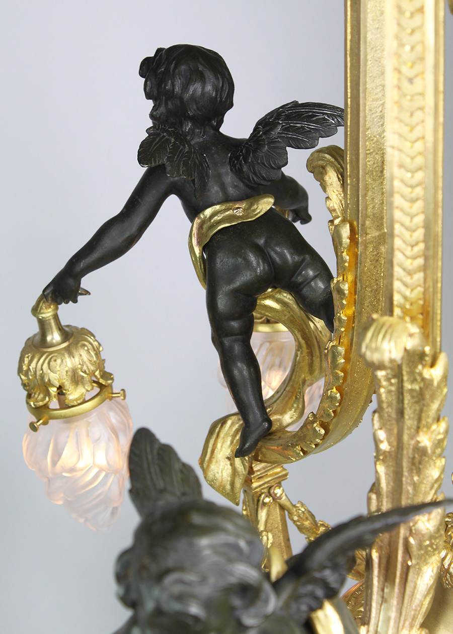 A Fine and Rare Whimsical French 19th/20th Century Belle Époque Gilt-Bronze and Patinated Bronze Figural Seven-Light Chandelier. The with frosted glass flame shades centered with a frosted edged-glass urn with a gilt-bronze rim and acorn finial, all surmounted with three patinated bronze hovering cherubs, each supporting a pair of light-branches. Circa: Paris, 1900.