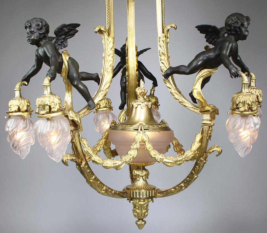 A Fine and Rare Whimsical French 19th/20th Century Belle Époque Gilt-Bronze and Patinated Bronze Figural Seven-Light Chandelier. The with frosted glass flame shades centered with a frosted edged-glass urn with a gilt-bronze rim and acorn finial, all surmounted with three patinated bronze hovering cherubs, each supporting a pair of light-branches. Circa: Paris, 1900.