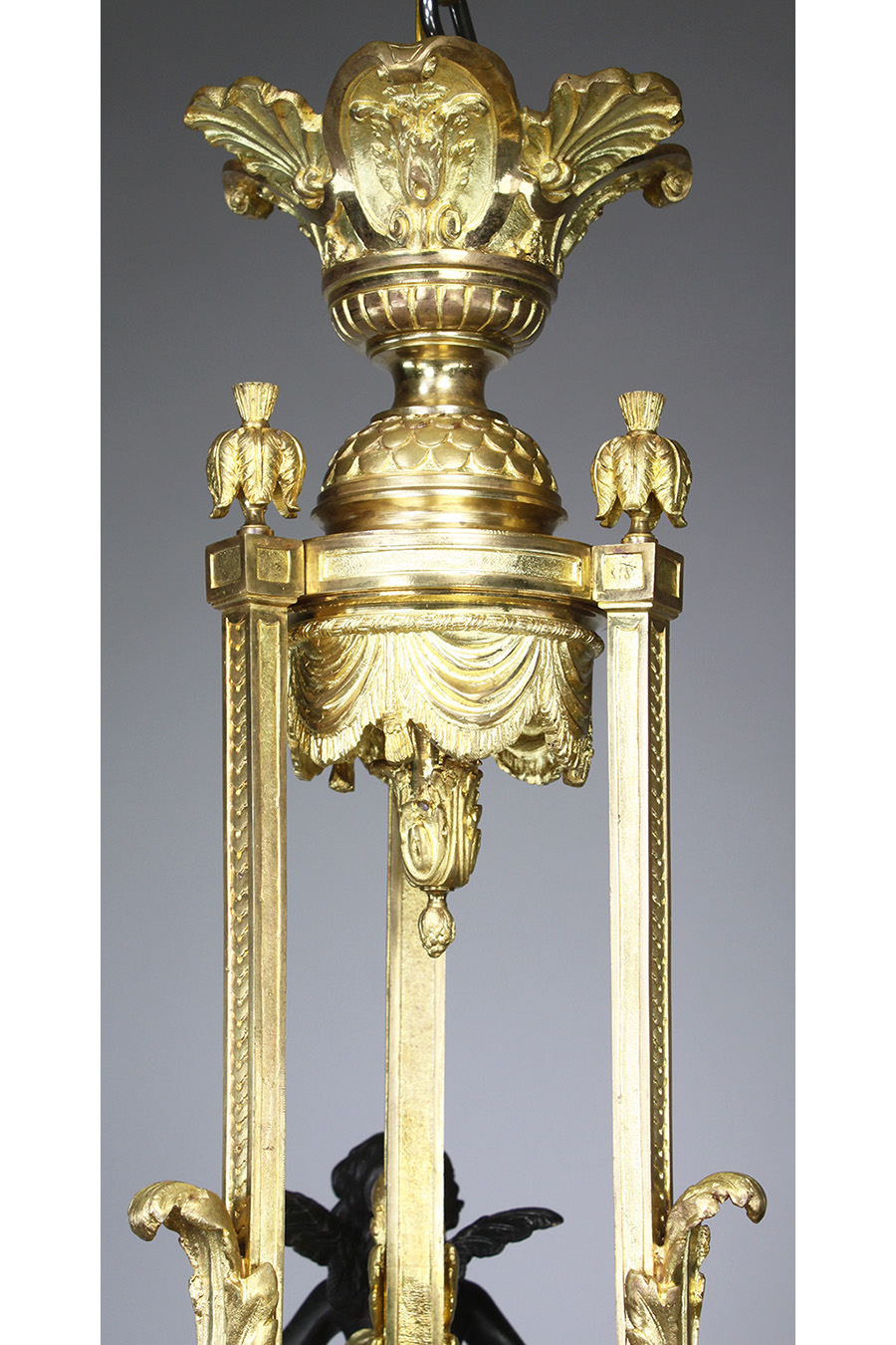 A Fine and Rare Whimsical French 19th/20th Century Belle Époque Gilt-Bronze and Patinated Bronze Figural Seven-Light Chandelier. The with frosted glass flame shades centered with a frosted edged-glass urn with a gilt-bronze rim and acorn finial, all surmounted with three patinated bronze hovering cherubs, each supporting a pair of light-branches. Circa: Paris, 1900.