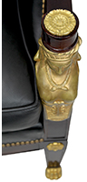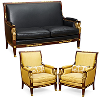 A Very Fine French Napoleon III Mahogany and Ormolu Mounted Three-Piece Salon Suite, after a model by the Parisian workshop of François-Honoré-Georges Jacob-Desmalter (1770–1841). The the Egyptomania style suite, which was fashioned after General Napoleon Bonaparte’s Egyptian Campaign (1798-1801), followed by the publication of the Voyage dans la Basse et Haute-Egypteby Dominique Vivant-Denon (1747-1825), comprising of a settee, recently upholstered in black-leather, surmounted with ormolu winged maidens and Imprerial ornaments throughout, and a pair of throne arm-chairs of equal design, upholstered in a yellow raw-silk. Circa: Paris, 1870.