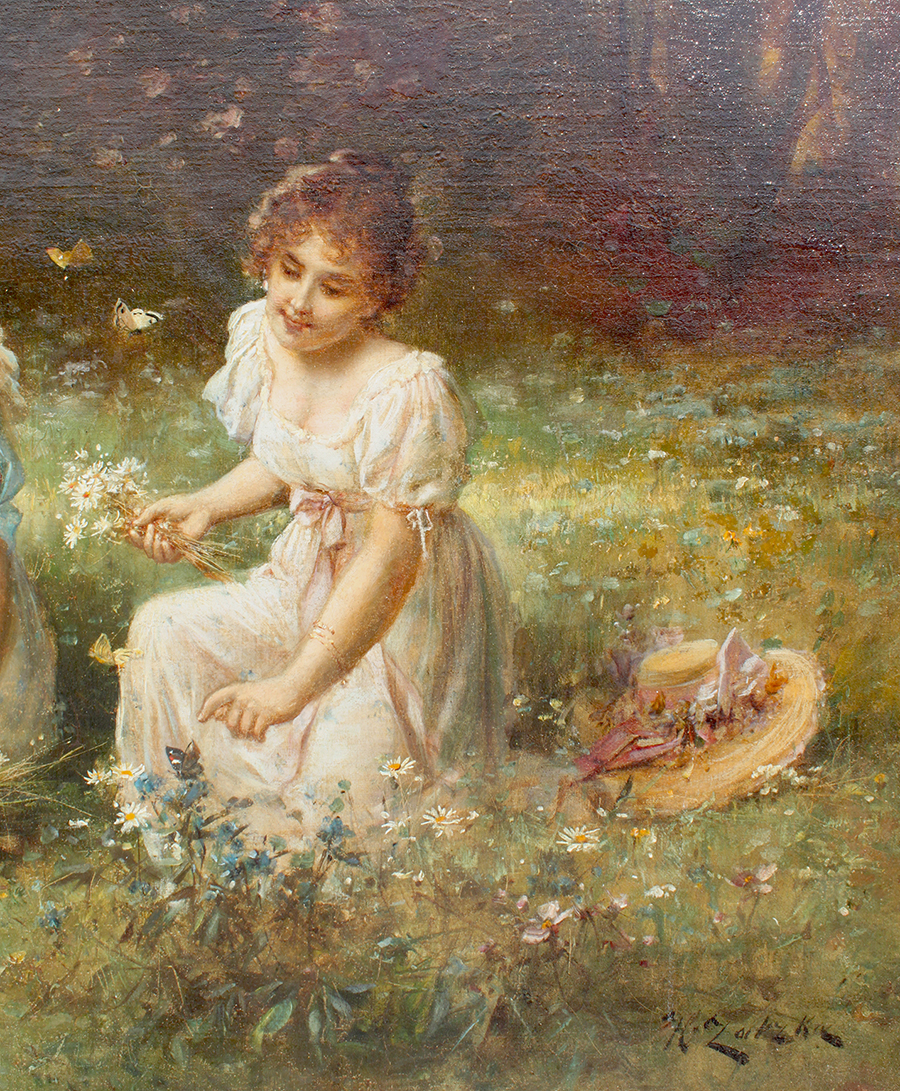 Hans Zatzka (Austrian, 1859-1945) A Very Fine and Charming Oil on Canvas "Spring Beauties", depicting three young maidens picking flowers by a lake. The three young girls sitting, kneeling and laying on a grassy area of the forest, her wicker basket filled with the freshly picked flowers, the middle one wearing a bonnet and a straw-hat laying on the ground behind with butterflies flying by, within a gilt-wood and gesso carved frame. Signed (l/r): H. Zatzka. Circa: 1890's.