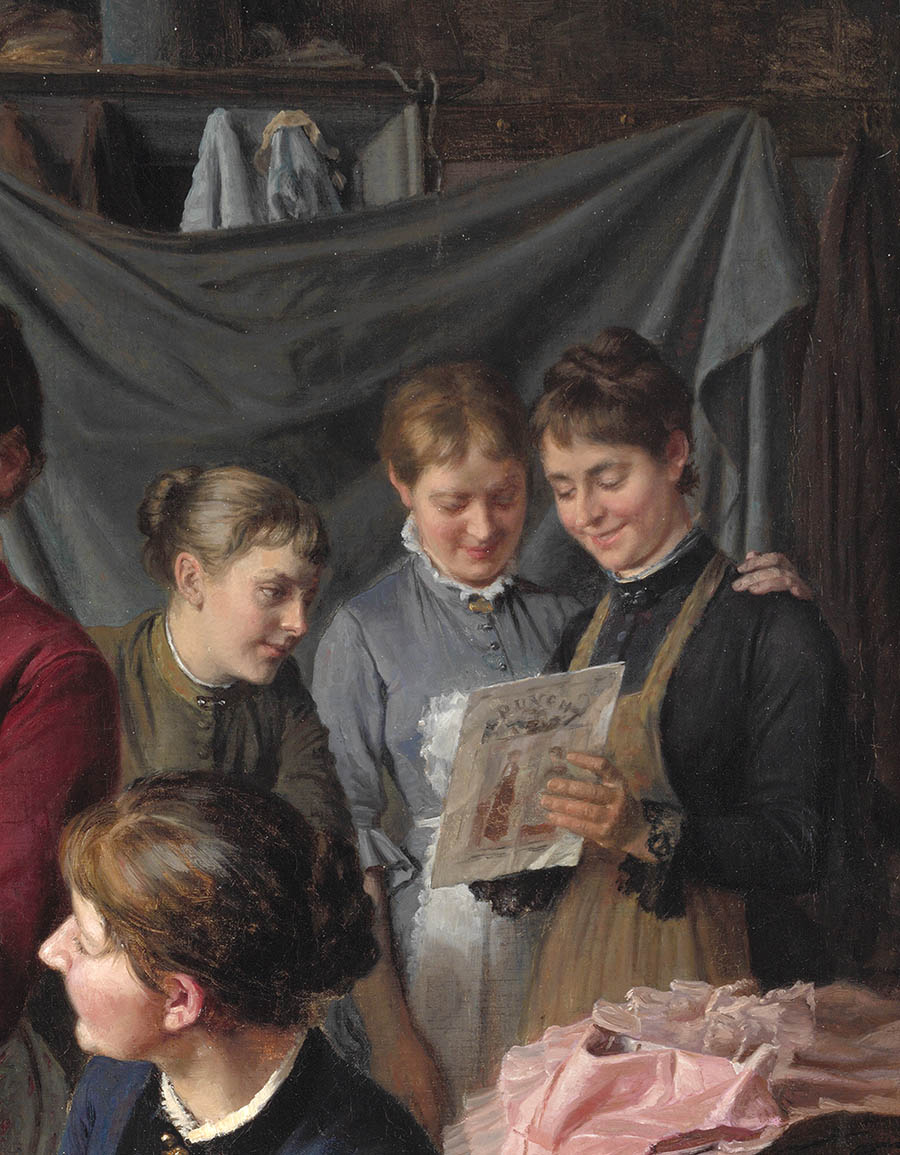 Wenzel Ulrik Tornøe (Danish, 1844-1907) A Very Fine and Large Oil on Canvas Titled "Systue" ("The Sewing Room"). The finely executed artwork depicting the interior scene of a 19th century sewing room, with eight dressmakers taking their lunch break; one maiden is opening a bottle of wine while another is holding a glass ready for the pour, the seated center one holding a cup of tea with a semi-wrapped sandwich, one leaning against the back wall, another resting with her elbow on a table and the other three standing maidens in the back viewing a catalogue/magazine page. Tornøe's capture of the expressions of exhaustion on the young seamstress’ faces, as well as the detailed background and the efficacy of painting the transparent glass on they young girl’s hand, are all truly exceptional, making this artwork probably one of Tornø’s best paintings. Signed and dated: Wenzel Tornøe, 1885. Circa: Denmark, 1885.