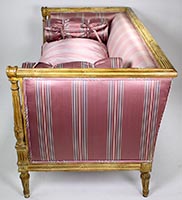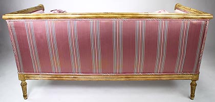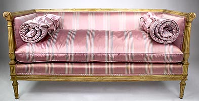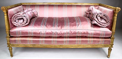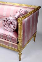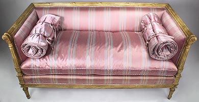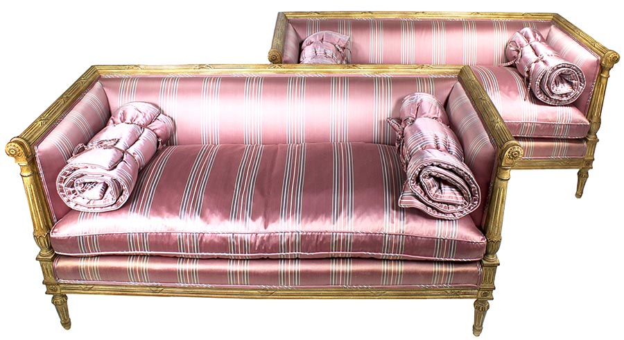 A Fine Pair of French Louis XVI Style Carved-wood Cream-Lacquered Settees, probably by Maison Jansen. The rectangular shaped Love Seats, each with scrolled carved armrests ending with rosettes, upholstered on all sides and with cushions and padded bolsters, both upholstered in a later striped burgundy and white satin silk and raised on four tapered fluted legs. Circa: Paris, 1900's.