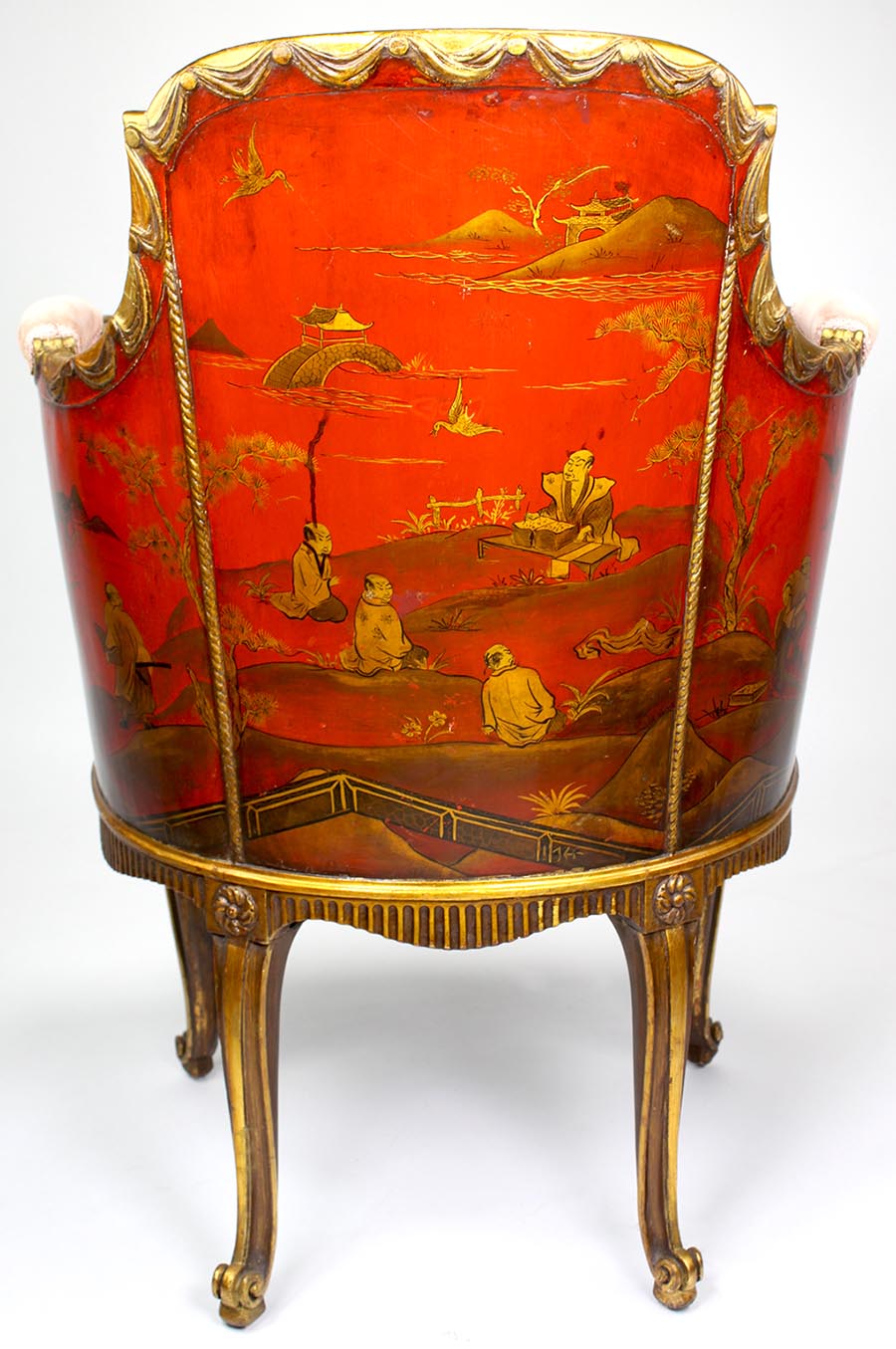 A Fine and Rare Assembled Set of Four French Louis XV Style Gilt-Wood Carved and Japanned-Chinoiserie Lacquer Decorated Bergers Armchairs, attributed to Maison Jansen (House of Jansen). The rounded barrel-shaped frames with padded backseat, interior sides and armrests upholstered in a Rosé colored velvet with cushion. The armrests with scrolled giltwood carved ends, the lower apron centered with rosettes and raised on four cabriolet legs. All armchairs finely hand painted on the outside frames with scenes of every-day country life, fishing, hunting, harvesting, traveling, courting, riding on boats, lecturing, exercising, crossing bridges, with flying Ho-Ho birds, lakes, temples and pagodas. Three armchairs in red-lacquer and one in brown lacquer. Circa: Paris, 1890-1900.