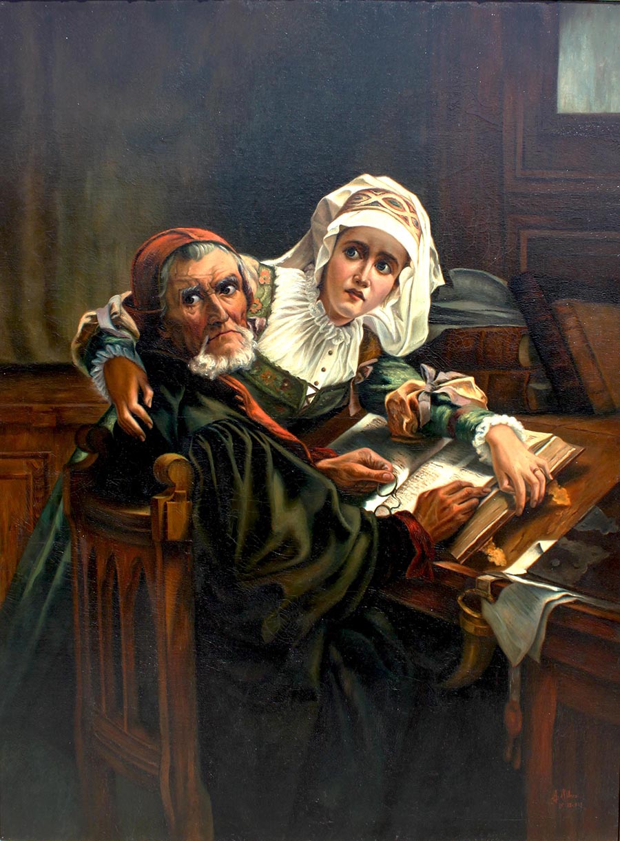 A Large Continental Oil on Canvas "The Prohibited Reading " after Karel Ooms (Belgium, 1845-1900). This beautiful executed painting depicts a historical scene of an old man and a young woman who are huddled over a bible. The pair is gazing in apparent concern or alarm, over the old man's shoulder, towards something outside of the picture. The scene is likely set in the 16th or 17th century when Protestants were prosecuted, amongst others, for reading the bible in the vernacular, a practice prohibited by the Catholic Church at the time. Signed (l/r) A. Ribas 15-12-913. Within a gildwood carved frame. Circa: Probably Belgium, 1913.