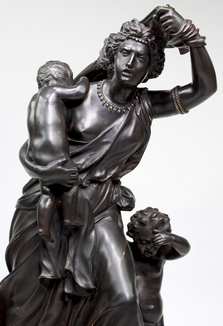 A Fine Italian Cast 19th Century Bronze Group Titled "La Tempête" (The Tempest) Probably after Mathurin Moreau (French, 1822–1912), Cast by The Alessandro Nelli Foundry in Rome. The finely executed Classical Roman style bronze sculpture in a dark brown patina depicting a young mother running for cover carrying her young baby on her arms and her todler by her side, raised on a black-slate and Bardiglio marble base. Stamped on base "Nelli - Roma". Circa: Rome, 1900.