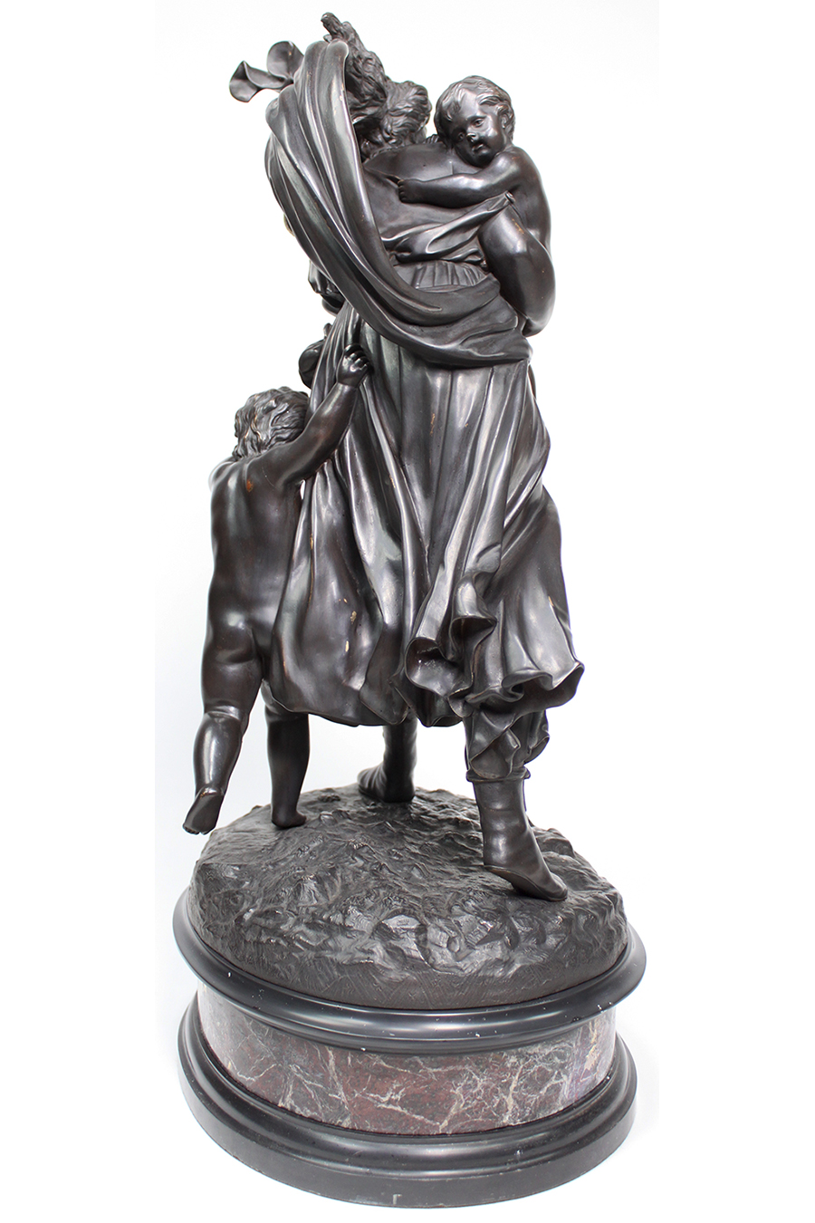 A Fine Italian Cast 19th Century Bronze Group Titled "La Tempête" (The Tempest) Probably after Mathurin Moreau (French, 1822–1912), Cast by The Alessandro Nelli Foundry in Rome. The finely executed Classical Roman style bronze sculpture in a dark brown patina depicting a young mother running for cover carrying her young baby on her arms and her todler by her side, raised on a black-slate and Bardiglio marble base. Stamped on base "Nelli - Roma". Circa: Rome, 1900.