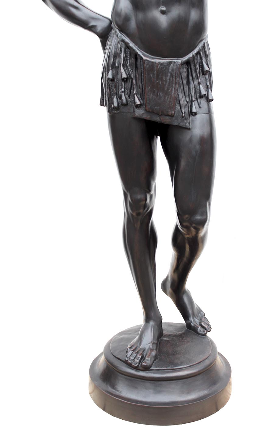 A Palatial Life-Size Pair of French 19th-20th Century Cast-Iron Torchères Sculptures figures of "Jongleur and Charmeur de Serpents" (Juggler and Snake-Charmer) After the model by Mathurin Moreau (French, 1822-1912), attributed to Le Societe Anonyme des Hauts-Fourneaux et Fonderies du Val D'Osne - 58 Boulevard Voltaire, Paris. The monumental pair of indoor or outdoor torchère lights, each torchère portrays a standing half-clothed black male engaging in traditional entertainment activities reflecting the cultural practices of the 19th century and early 20th century, one as a juggler and the other one as a snake charmer. The skill and cultural context of these impressive pair of sculptures add depth and charm highlighting the artistic technics, and the emotions being conveyed by each figure. The present pair of torchere are based on the engravings of Statues published by the celebrated sculptor, Mathurin Moreau (d. 1912). As their trade catalogues reveal, Moreau's oeuvre was extensively reproduced by the Val d'Osne foundry during the latter quarter of the 19th century (see photos of the Val d'Osne original catalogue). Established in 1835 by André, Val d'Osne was subsequently renamed Houille et Cie. in 1867 when taken over by Barbezat. By 1870, however, it was known as the Société Anonyme des Hautes Fourneaux & Fonderies du Val d'Osne, exhibiting its wares in a Paris showroom at Boulevard Voltaire. Unsigned. (Electrified). Circa: Paris, 1890-1900.