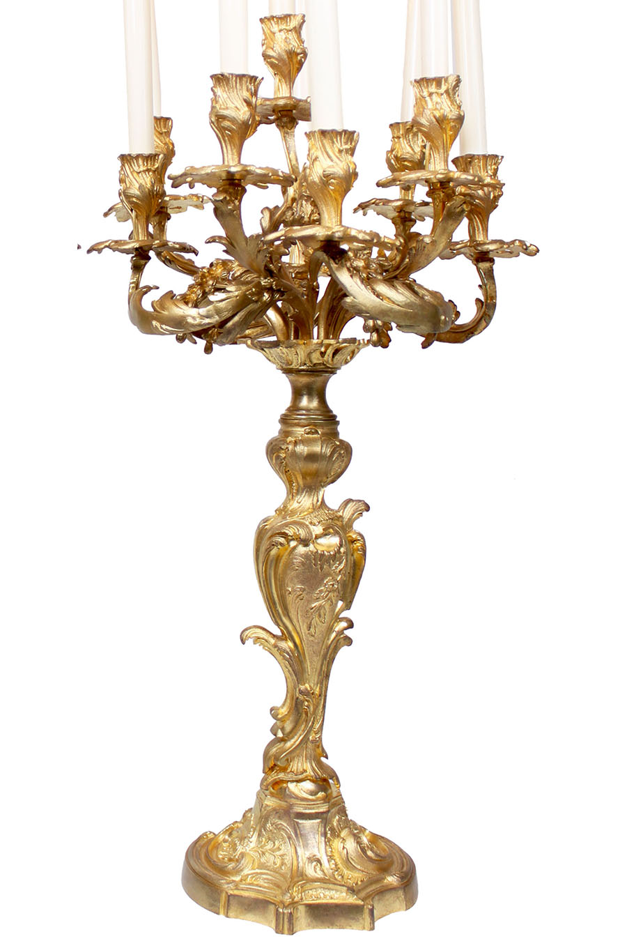 A Pair of French 19th Century Louis XV Style Gilt-Bronze Nine-Light Candelabra. The impressive pair of candelabrum, each on a floral stem base surmounted with nine scrolled candle-arms with acanthus, leaves and fruit decorations. (Electrified). Circa: Paris, 1880-1900.