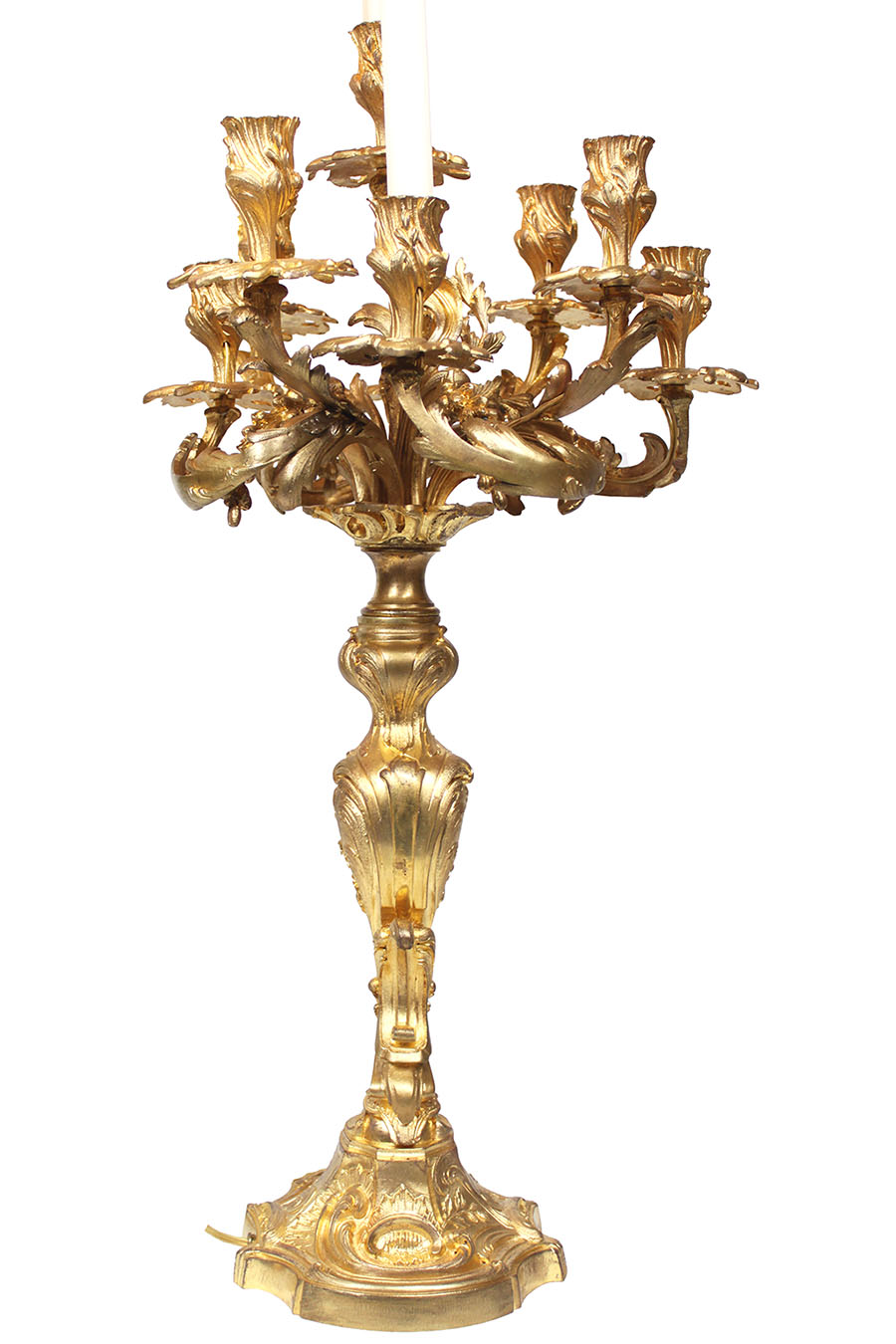 A Pair of French 19th Century Louis XV Style Gilt-Bronze Nine-Light Candelabra. The impressive pair of candelabrum, each on a floral stem base surmounted with nine scrolled candle-arms with acanthus, leaves and fruit decorations. (Electrified). Circa: Paris, 1880-1900.