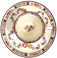 A Set of 5 English Hand-Decorated Minton Fine China Espresso Cups with Saucers. The beautifully vibrant color hand painted small espresso cups and saucers, each single handle cup and saucer plates decorated with a colorful floral design, an intricate trim and swagged floral strands, centered with a floral bouquet. All bearing the 'MINTONS - EST. 1793 - ENGLAND' under-glaze purple markings and 'MINTONS' under-glaze seal. Circa: 1912-1950.