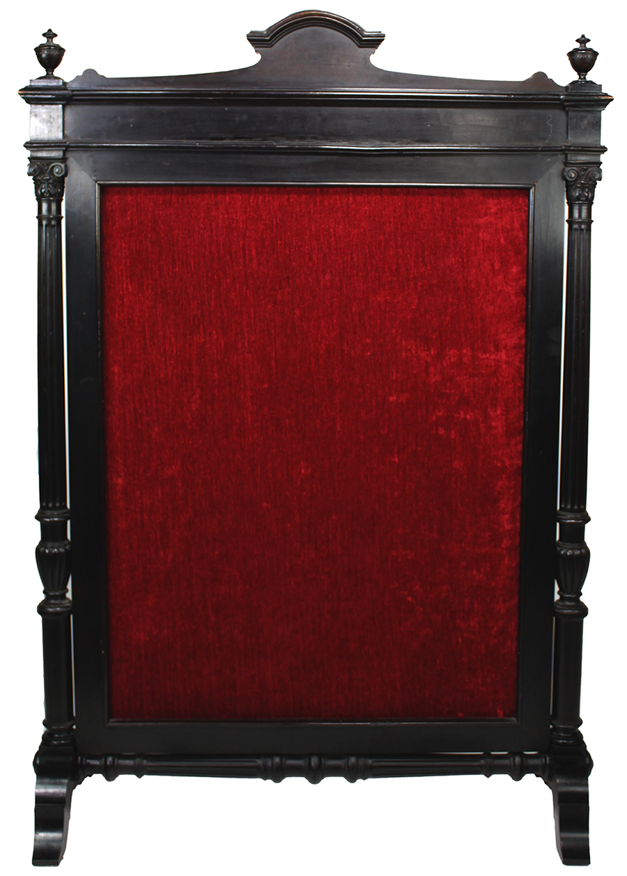 A Fine English 19th Century Victorian Ebonized Wood and Edged Bone-Inlaid Summer Fireplace Screen. The ornately decorated screen centered with a needlepoint tapestry of a Tarot card reader attending to a lady and her friend. Circa: 1880-1890.