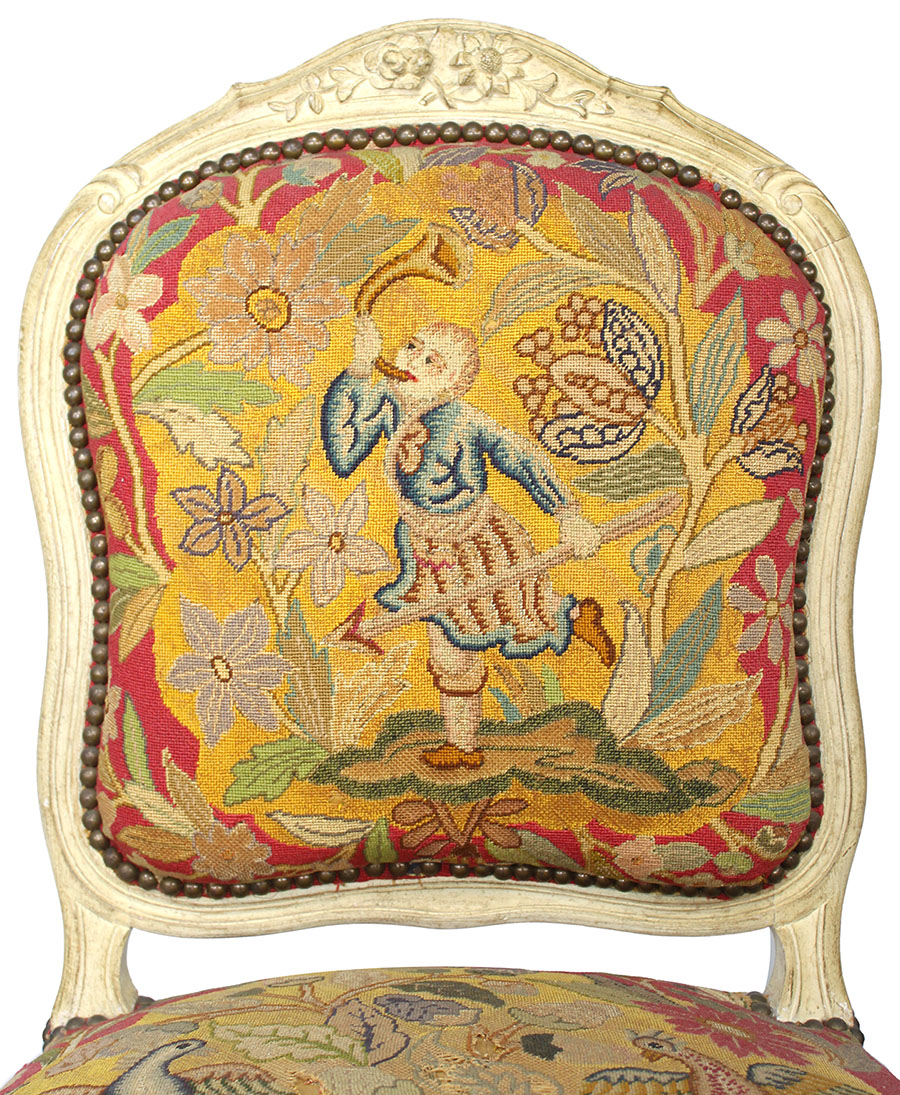 A Pair of French 19th Century Louis XV Style Carved White-Lacquer-Finished and Needlepoint Tapestry Side Chairs, raised on four cabriolet legs, the front legs with coasters. Circa: Paris, 1890-1900.