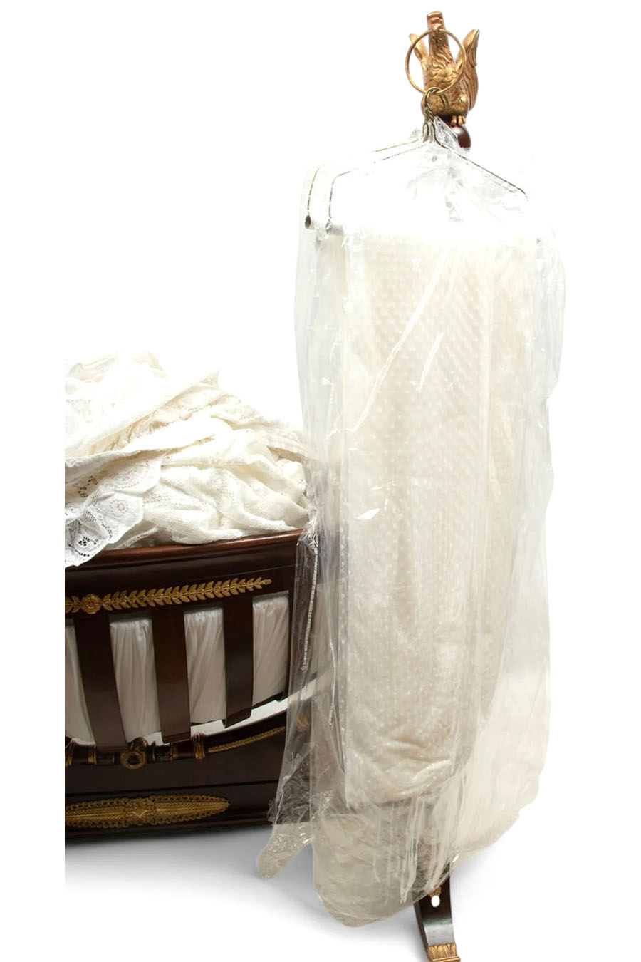 A Very Fine French 19th Century Empire Style Mahogany and Ormolu Mounted Crib & Bedding. The egg-shaped oblong rocking cradle supported at each end by columnar standards.The cradle base conforms to the rocking cradle and is adorned with laurel wreath gild bronze corner crests, all supported on cabriole legs with finely cast gild bronze acanthus leaf mounts. Turned gilded bedding and drapery support having a cast gilt bronze terminal of an eagle holding a ring in its beak. It also includes mattresses, bedding, Irish hand embroidered linens and matching draperies. One pair of Irish linen draperies measures 25" X 124". One pair measures 20" (10" with curtain rod hooks) x 124". Circa: 1860-1870.