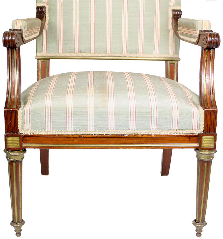 Pair of French 19th-20th Century Louis XVI Style Mahogany and Gilt-Metal Mounted High-Back Armchairs. Circa: Paris, 1890-1900.