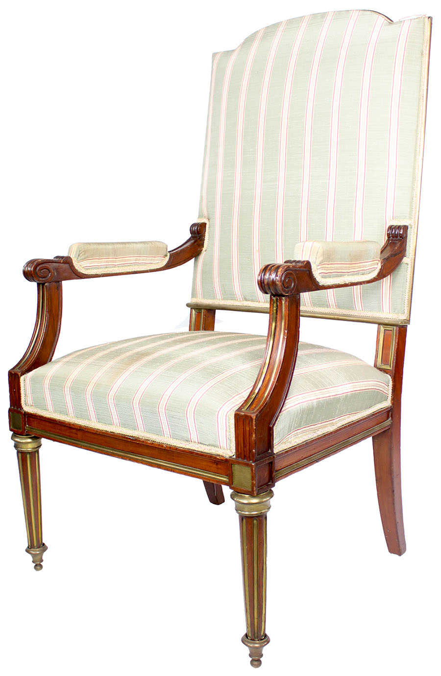 Pair of French 19th-20th Century Louis XVI Style Mahogany and Gilt-Metal Mounted High-Back Armchairs. Circa: Paris, 1890-1900.