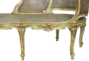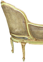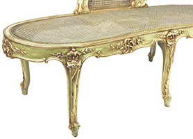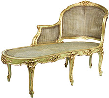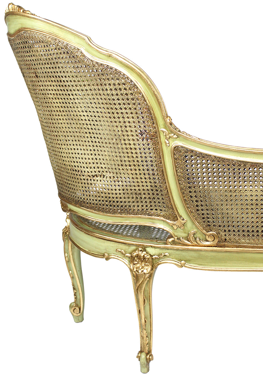 A French Louis XV Style Green-Lacquered and Parcel Giltwood Carved Chaise Lounge Armchair. The rounded backrest carved and caned frame in the shape of an extended armchair, with an extended armrest, parcel-gilt carving details and raised on six cabriolet legs. Circa: Paris, 1920-1930.