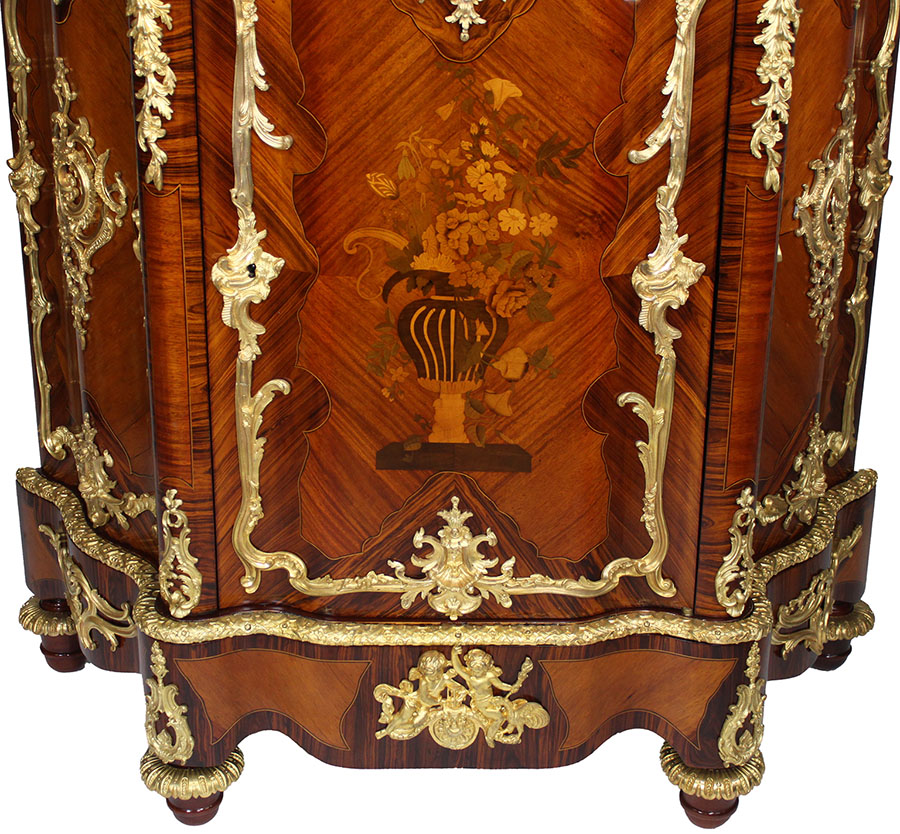 A Fine Pair of French 19th-Century Louis XV-style Marquetry and Gilt-Bronze Mounted Meuble d'Appui Side-Cabinets with marble tops. Each single-door satinwood veneer side cabinet is centered with a marquetry design featuring a vase with a floral arrangement, surmounted by ornate floral and acanthus ormolu mounts. The cabinets include a pierced floral ormolu apron and an allegorical gilt-bronze mount at the bottom, depicting a pair of cherubs holding a flame and a sand-glass next to a bird; fitted with a later light-beige marble tops. (Refinished). Circa 1870-1880.