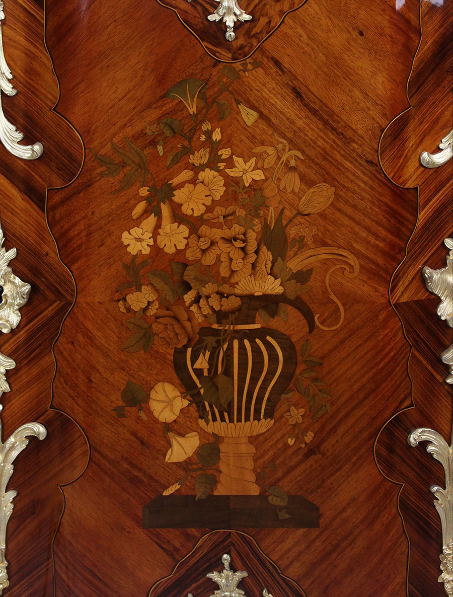 A Fine Pair of French 19th-Century Louis XV-style Marquetry and Gilt-Bronze Mounted Meuble d'Appui Side-Cabinets with marble tops. Each single-door satinwood veneer side cabinet is centered with a marquetry design featuring a vase with a floral arrangement, surmounted by ornate floral and acanthus ormolu mounts. The cabinets include a pierced floral ormolu apron and an allegorical gilt-bronze mount at the bottom, depicting a pair of cherubs holding a flame and a sand-glass next to a bird; fitted with a later light-beige marble tops. (Refinished). Circa 1870-1880.