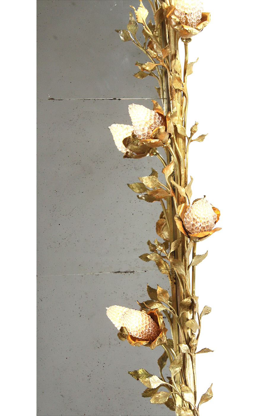A Fine French whimsical Belle Époque grape-vines gilt-metal, gilt-brass and giltwood console and mirror with fifteen floral lights. The ornately decorated domed floral paneled mirror surmounted with floral lights fitted with beaded light-bulbs, raised on a giltwood console with an equally decorated gilt-metal floral vines. Circa: Paris, 1900-1920.