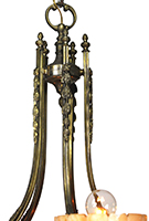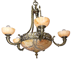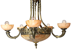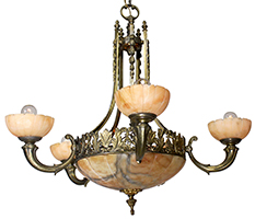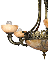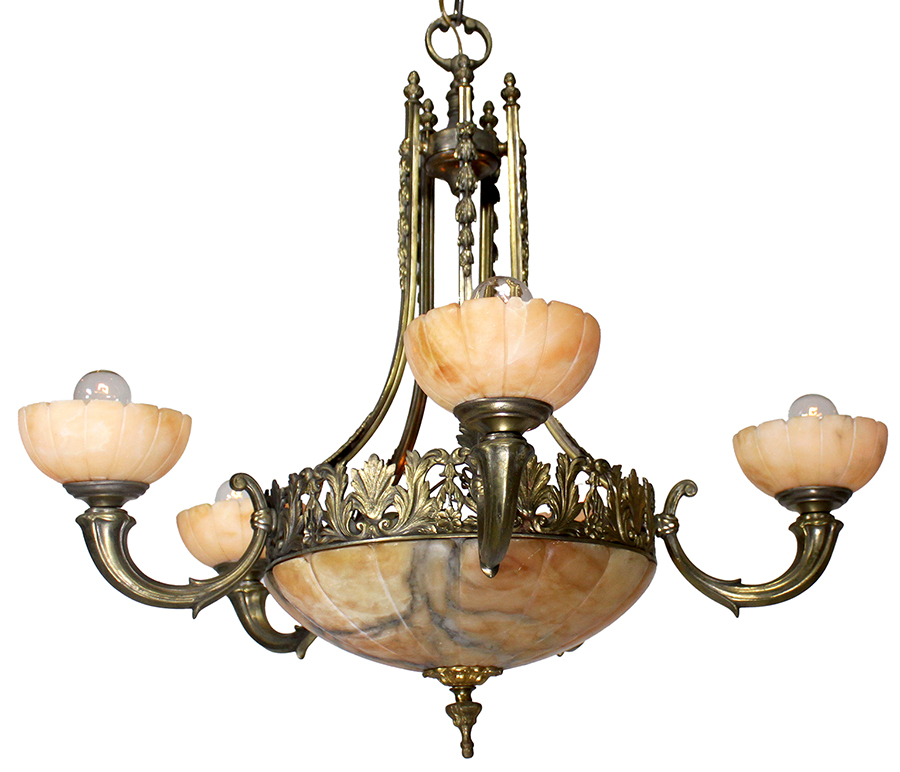 A French Early 20th Century Art Deco Bronze and Carved Alabaster Five-Light Chandelier. The pierced bronze frame, suspended by five scrolled braces with acanthus decorations, surmounted by five scrolled cornucopia shaped arm-lights, all fitted with carved alabaster shades, the center supporting a large carved alabaster plafonnier with two interior lights and an acorn shaped finial. Circa: Paris, 1920-1930.