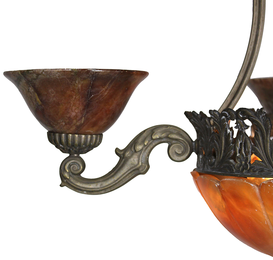 A French Early 20th Century Art Deco Silvered Bronze and Carved Caramel-Colored Alabaster Four-Light Chandelier. The pierced silvered bronze frame, suspended by four scrolled braces with acanthus decorations, surmounted by four scrolled shaped arm-lights, all fitted with carved alabaster shades, the center supporting a large carved alabaster plafonnier with two interior lights and an acorn shaped finial. Circa: Paris, 1920-1930.