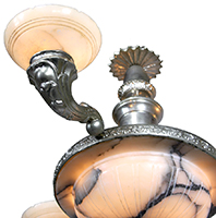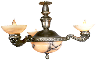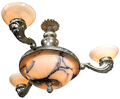 A French Early 20th Century Art Deco Silvered Metal and Carved Veined Alabaster Three-Light Chandelier. The circular silvered frame suspended by a center stem with a sunburst canopy, with three scrolled cornucopia shaped arm-lights, all fitted with carved alabaster shades, the center supporting a large carved alabaster plafonnier with two interior lights and an acorn shaped finial. Circa: Paris, 1920-1930.