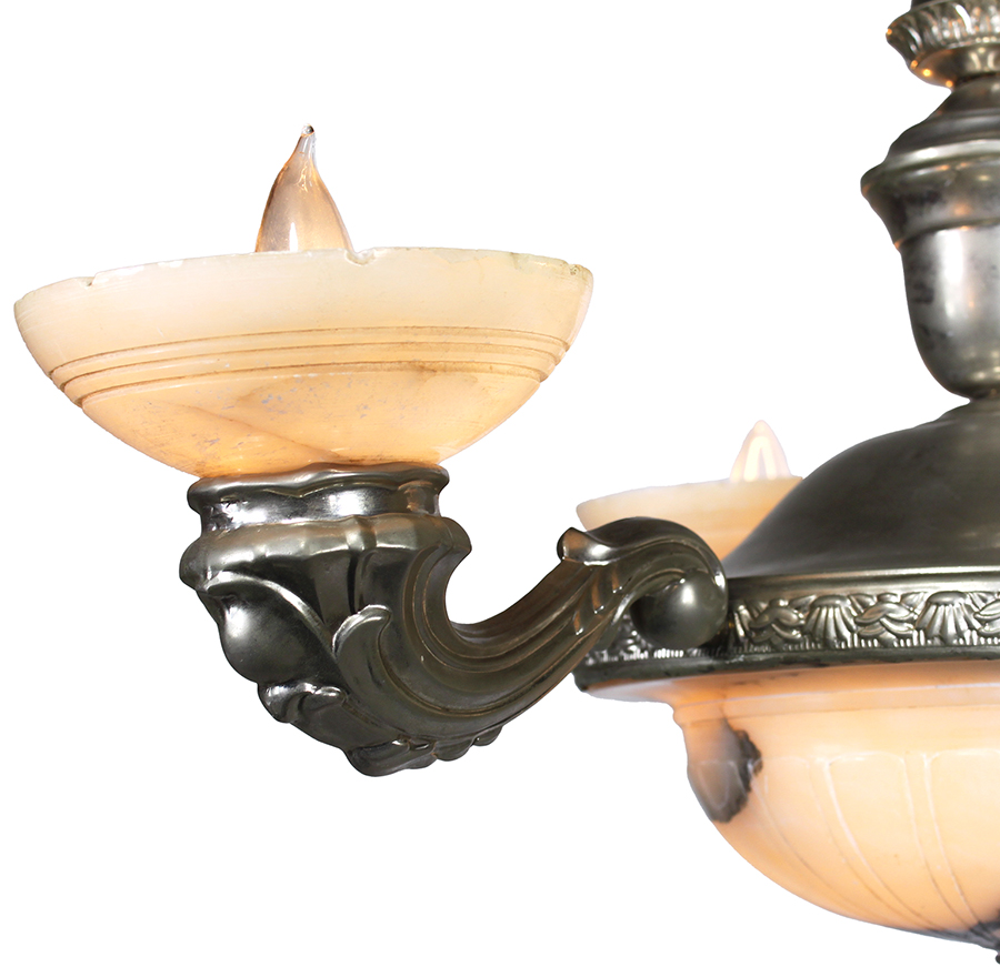 A French Early 20th Century Art Deco Silvered Metal and Carved Veined Alabaster Three-Light Chandelier. The circular silvered frame suspended by a center stem with a sunburst canopy, with three scrolled cornucopia shaped arm-lights, all fitted with carved alabaster shades, the center supporting a large carved alabaster plafonnier with two interior lights and an acorn shaped finial. Circa: Paris, 1920-1930.