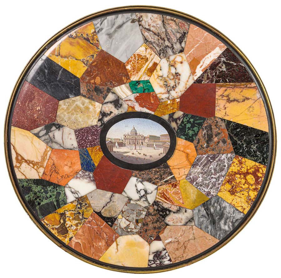 Among the intricate mosaic creations intended for furnishings, micromosaic tables were particularly widespread, crafted by Roman workshops in various shapes and styles. Masterpieces of this kind are preserved in prestigious international museums such as the Hermitage in St. Petersburg, the Victoria and Albert Museum in London, and the Palace of Versailles . One of the most successful types features views of Rome framed within panels of precious stones. Equally prized were tabletops where micromosaics were combined with inlays of fine marbles, known as commesso. Here, we present a significant example of this type. The commesso sections represented veritable “display collections” of rare stones.