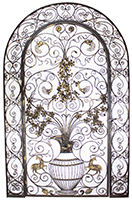 A Fine and Rare Ornate 20th Century Wrought Iron and Parcel-Gilt Figural Entry or Wine-Cellar Gate in the manner of Edgar Brandt (French, 1880–1960). The intricately designed Art Deco-style single-door domed frame features scrolled ornamentation, surmounted by a vase with floral branches and grape clusters, and flanked by a pair of parcel-gilt leaping gazelles. Circa: Likely French, Mid-20th Century.